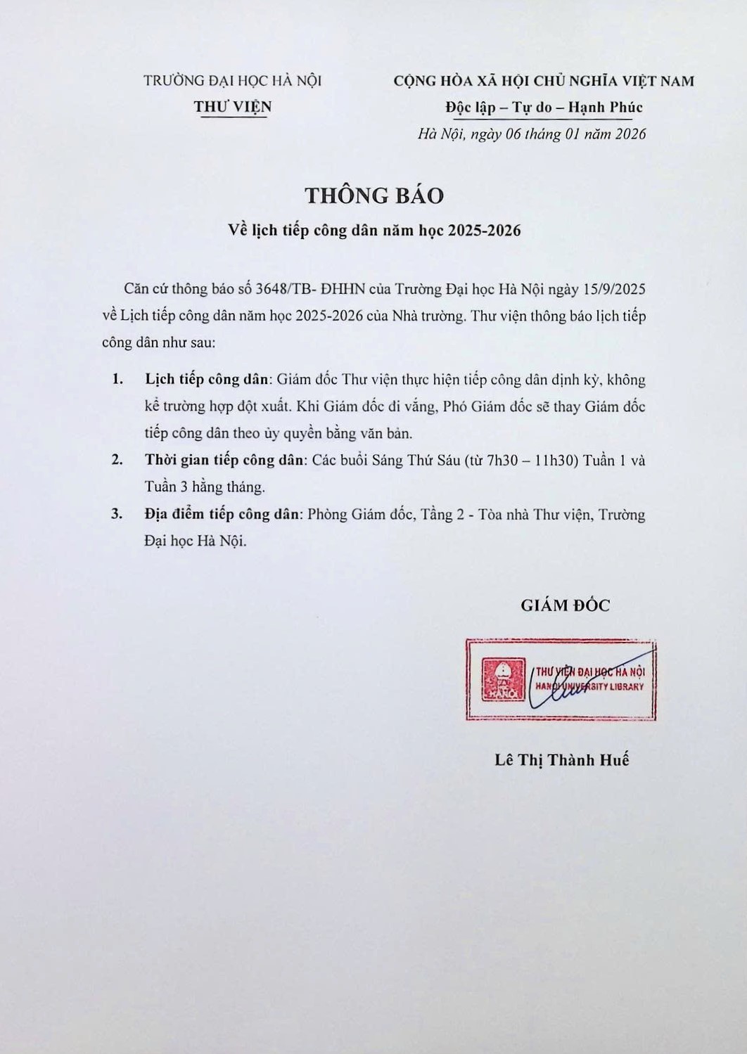 THÔNG BÁO VỀ LỊCH TIẾP CÔNG DÂN NĂM HỌC 2025-2026