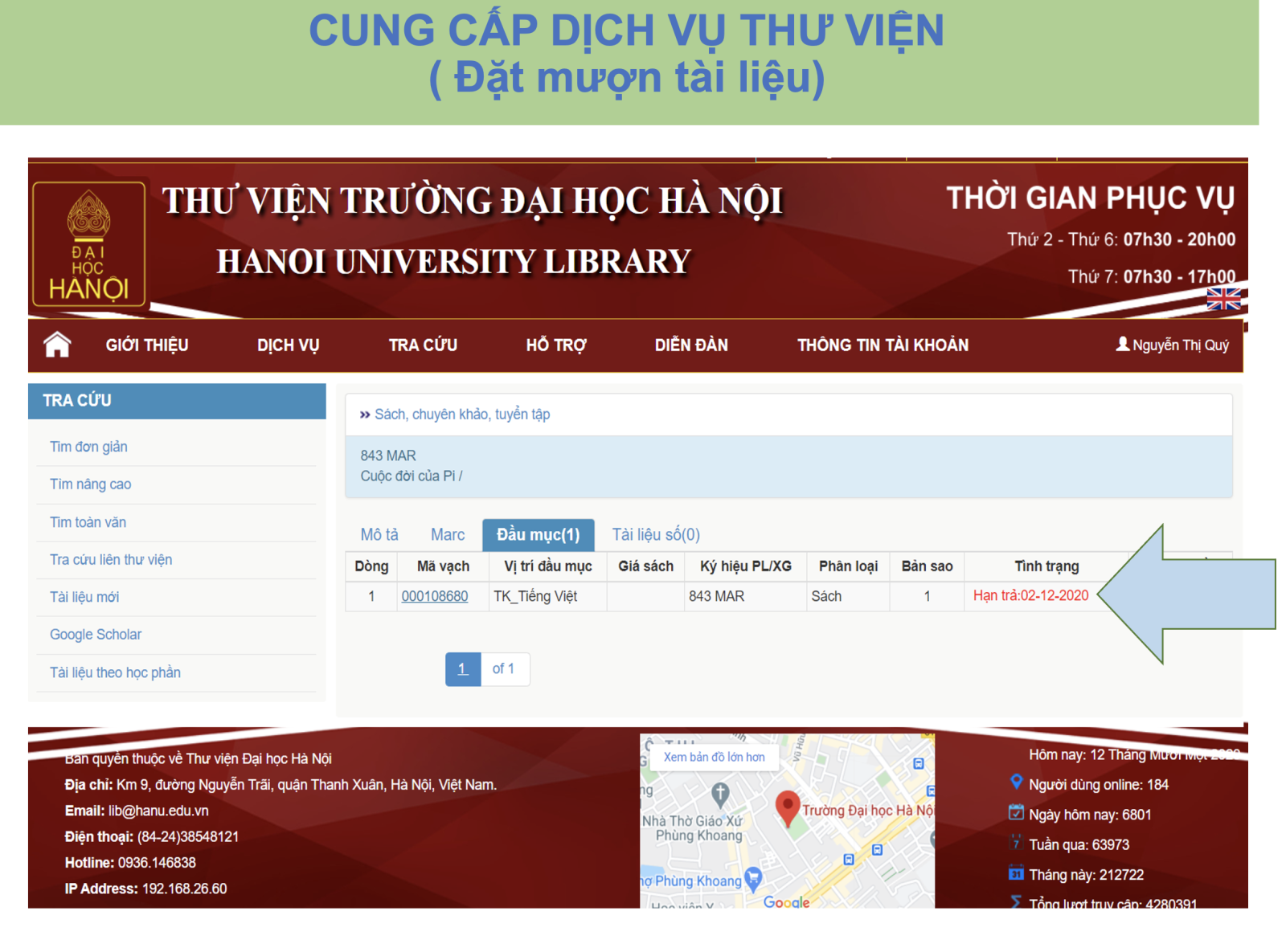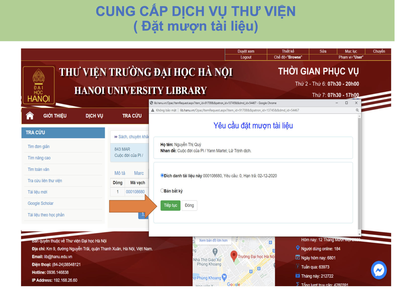 Bước 3: Chọn Mục "Thông tin đặt mượn "