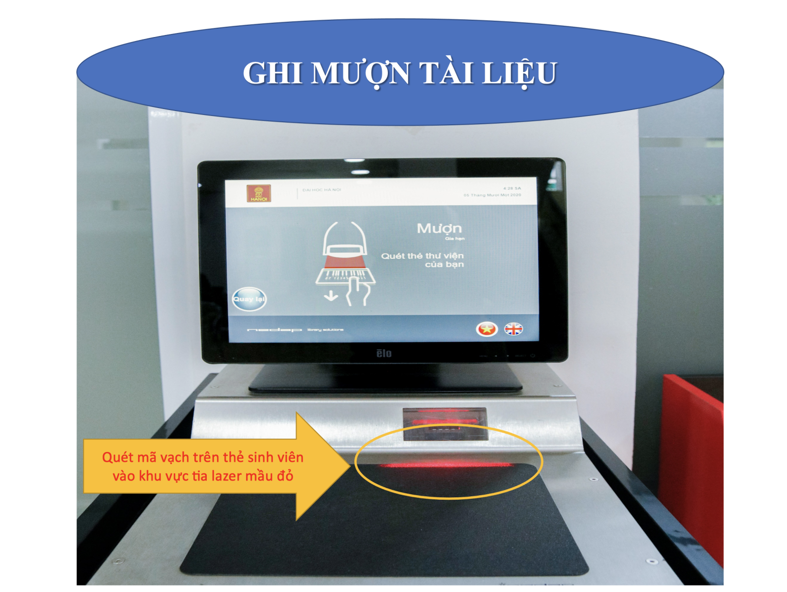 Bước 1: Tại màn hình máy Mượn - Gia hạn tài liệu - Đưa thẻ thư viện của bạn (phần chứa mã vạch) vào vị trí đầu đọc mã vạch ( có tia lazer mầu đỏ) . Khi hệ thống nhận diện đúng bạn đọc sẽ hiển thị thông tin bạn đọc.