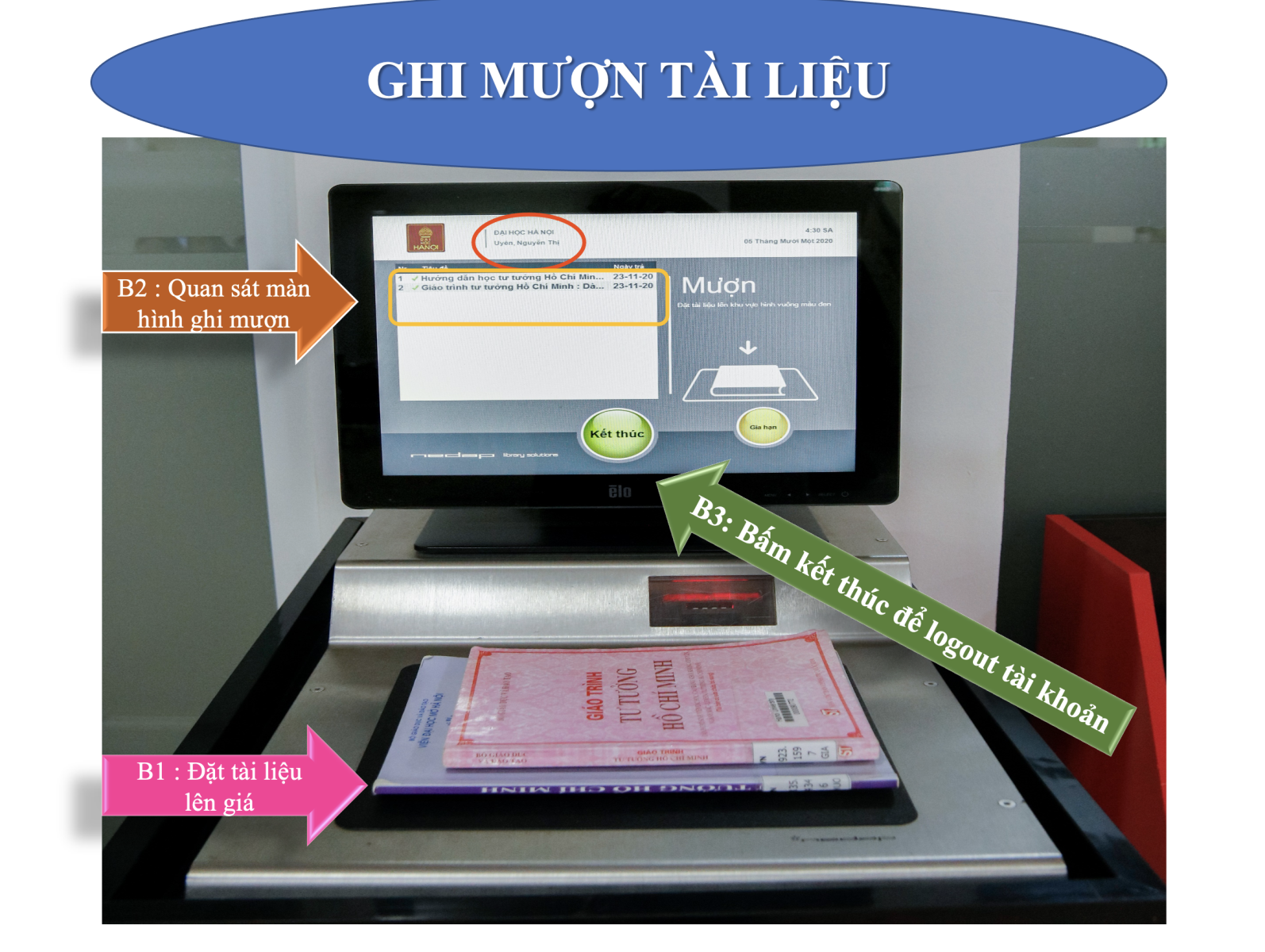 Bước 2: Đặt tài liệu muốn mượn lên và đợi giao diện màn hình hiển thị tất cả các tài liệu mượn. Sau khi hoàn thành quá trình mượn/ gia hạn tài liệu. Nhấn nút “Kết thúc” để kết thúc quá trình.