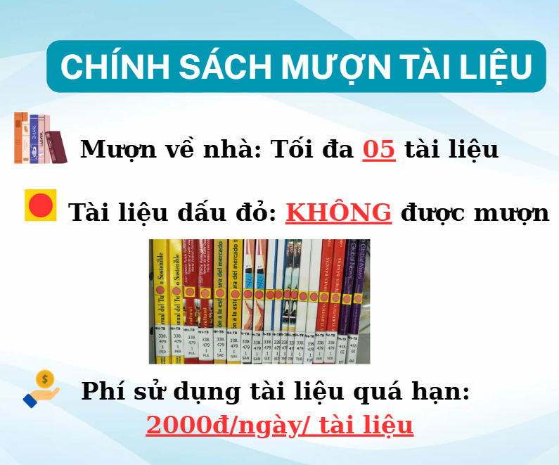 Lưu ý: Bạn đọc cần chuẩn bị thẻ sinh viên và kiểm tra kĩ tình trạng tài liệu trước khi mượn. Bạn đọc có trách nhiệm bảo quản tài liệu trong thời gian mượn tài liệu.